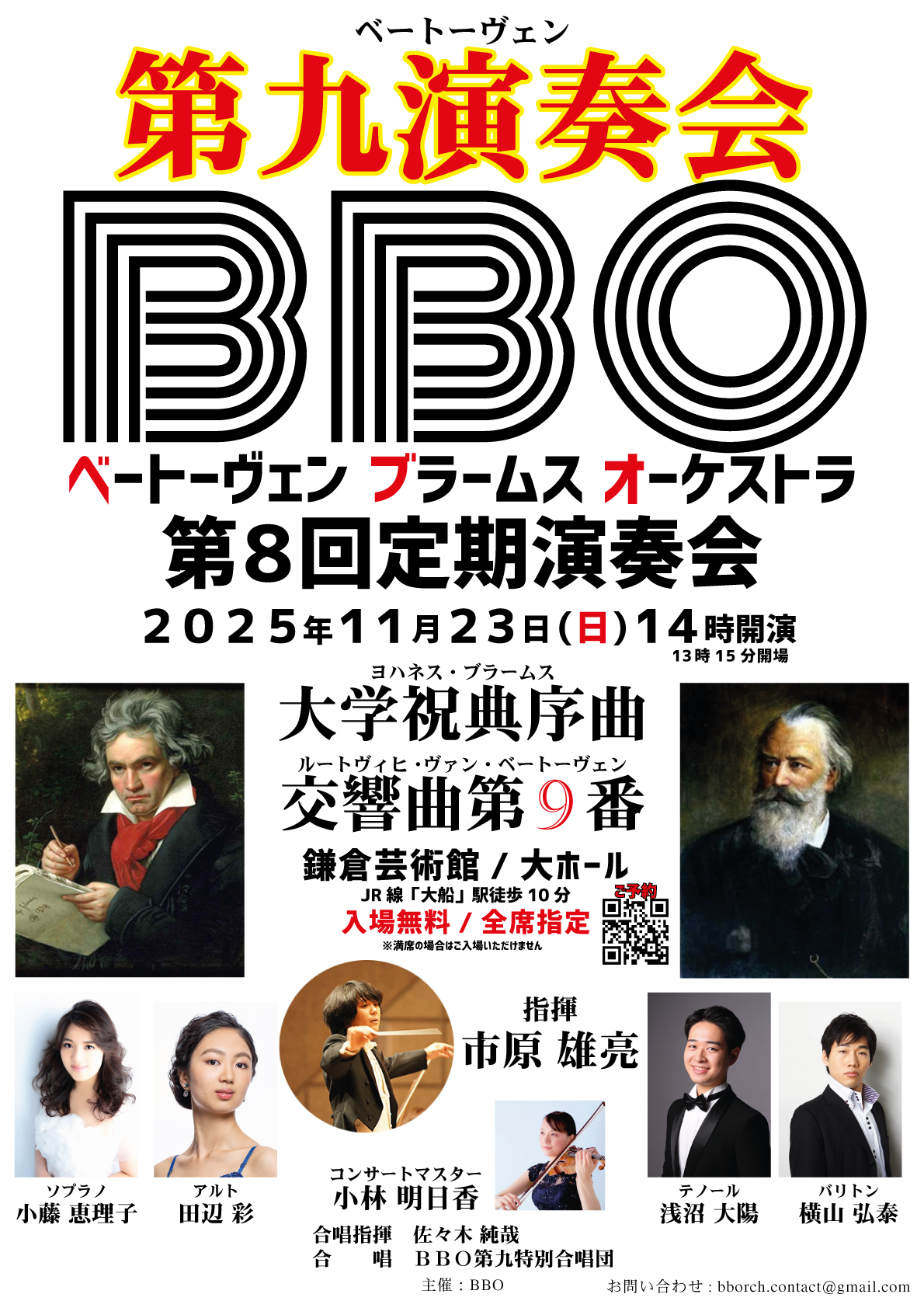 BBO 第8回定期演奏会~第九演奏会~ concert X Facebook はてブ LINE コピー 2025.11.232026.03.27 2025年11月23日(日)14時開演鎌倉芸術館 大ホール 大学祝典序曲 / J. ブラームス交響曲第9番 / L. v. ベートーヴェン 入場無料(全席指定)