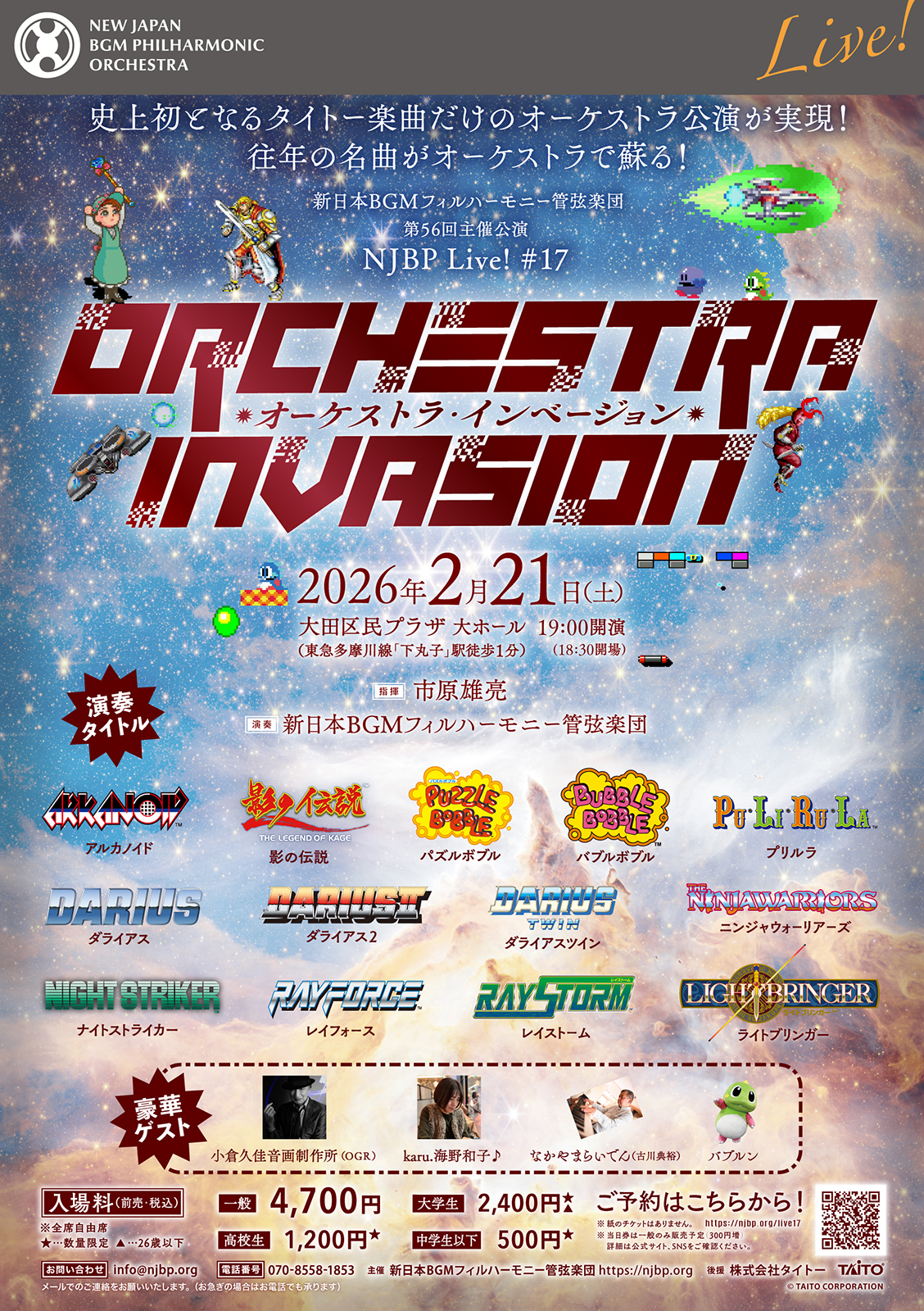 NJBP Live! #17 “オーケストラ・インベージョン” concert X Facebook はてブ LINE コピー 2025.12.09 2026年2月21日(土)19時開演大田区民プラザ 大ホール [会場詳細] タイトー特集 [公演詳細] 一 般:4,700円大学生:2,400円(26歳以下)高校生:1,200円中学生以下:500円(全席自由席)